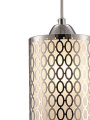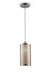 The Charon range utilizes slim cylindrical glass shades. Every glass is frosted and decorated with round chrome patterns. The 3 light line and one of the single pendants displays a pattern consisting of multiple circles in different sizes. The second single pendant has a symetrical oval design contributing variety to the collection. Charon uses E27 lampholders and takes 60W maximum lamps.