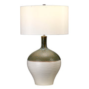 A dapple textured reactive glaze with tones of Green, Turquoise and Gold contrasts with a Textured Cream base. Completed with a Cream faux silk cylinder shade and Polished Nickel finial.
