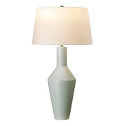 A Pale Sage Green matt finished ceramic vase, completed with an Ivory polycotton, tapered cylinder shade and Polished Nickel finial.