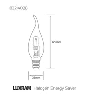 • Collection Name - Halogen Energy Saver Candle Tip • Finish - Clear • Weight - 0.025kg • Dimension Length - • Dimension Width - • Dimension Diameter - 35mm • Dimension Height - 120mm • Energy Class - D • Lamp Socket - E14 • Colour Temperature - 3000K Warm White • Beam Angle - • Lumens - • CRI - • Voltage - 220-240V~50/60Hz • Switched - • Dimmable - Yes - Suitable Dimmer Required • IP Rating - • Average Life Hrs - 2000hrs • Warranty - 2yrs
