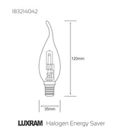 • Collection Name - Halogen Energy Saver Candle Tip • Finish - Clear • Weight - 0.025kg • Dimension Length - • Dimension Width - • Dimension Diameter - 35mm • Dimension Height - 120mm • Energy Class - C • Lamp Socket - E14 • Colour Temperature - 3000K Warm White • Beam Angle - • Lumens - • CRI - • Voltage - 220-240V~50/60Hz • Switched - • Dimmable - Yes - Suitable Dimmer Required • IP Rating - • Average Life Hrs - 2000hrs • Warranty - 2yrs