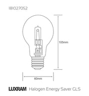 • Collection Name - Halogen Energy Saver GLS • Finish - Clear • Weight - 0.055kg • Dimension Length - • Dimension Width - • Dimension Diameter - 60mm • Dimension Height - 105mm • Energy Class - C • Lamp Socket - E27 • Colour Temperature - 3000K Warm White • Beam Angle - • Lumens - • CRI - • Voltage - 220-240V~50/60Hz • Switched - • Dimmable - Yes - Suitable Dimmer Required • IP Rating - • Average Life Hrs - 2000hrs • Warranty - 2yrs