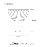 • Collection Name - Multi-LED GU10 • Finish - Clear, Polished Chrome • Weight - 0.07kg • Dimension Length - • Dimension Width - • Dimension Diameter - 50mm • Dimension Height - 56mm • Energy Class - A • Lamp Socket - GU10 • Colour Temperature - RGB • Beam Angle - 20° • Lumens - • CRI - • Voltage - 220-240V~50/60Hz • Switched - • Dimmable - No • IP Rating - • Average Life Hrs - 20000hrs • Warranty - 5yrs